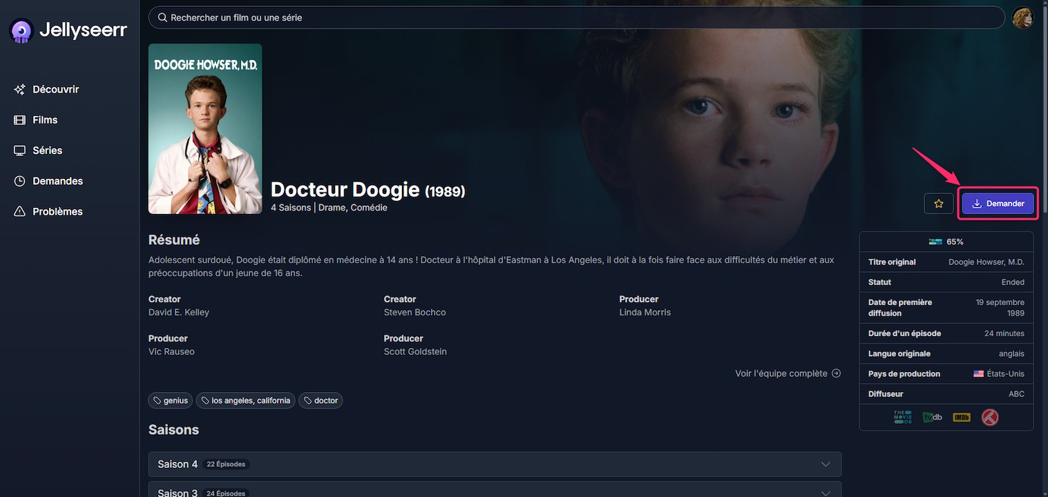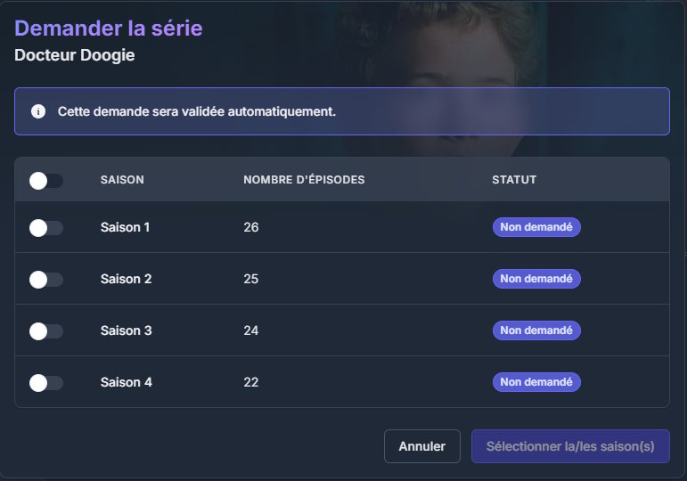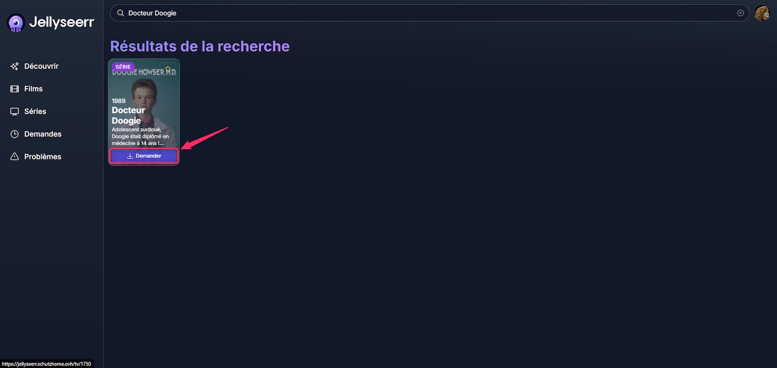 Cliquer sur la série souhaitée pour accéder à la fiche de la série ou cliquer directement sur Demander au survol de l'affiche |