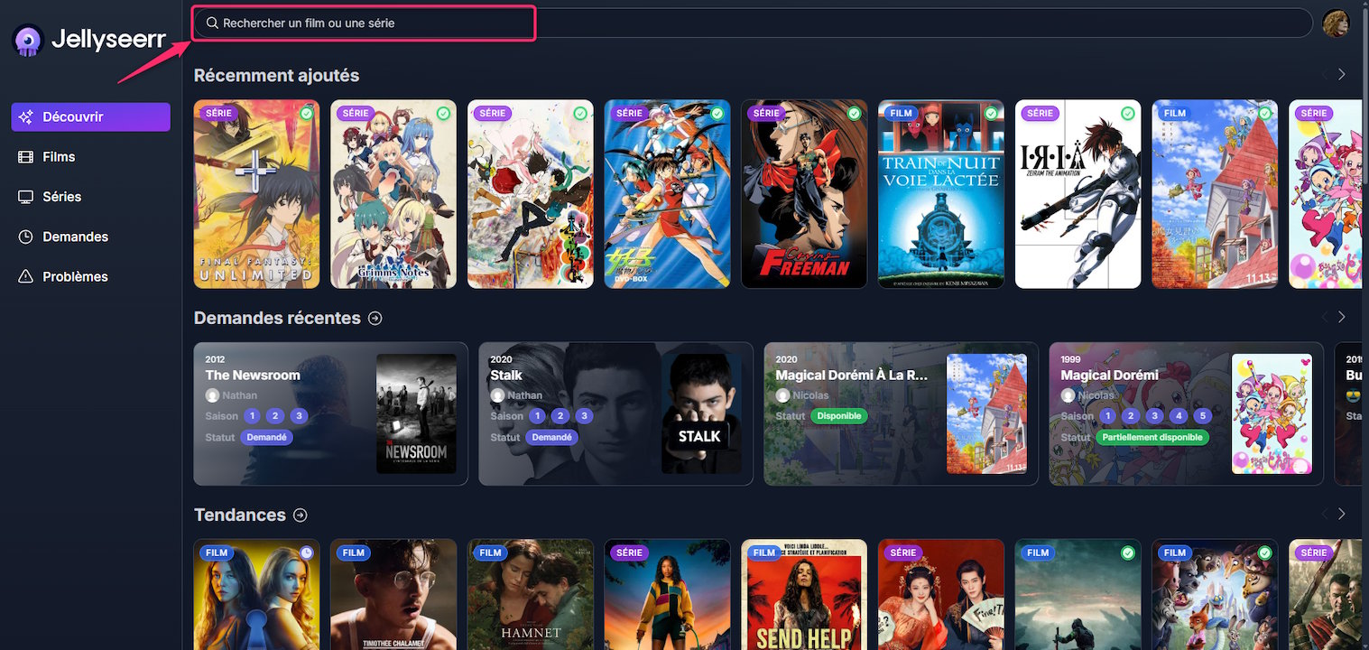 Faire une recherche dans la barre de recherche ou explorer les pages Découvrir et Séries |